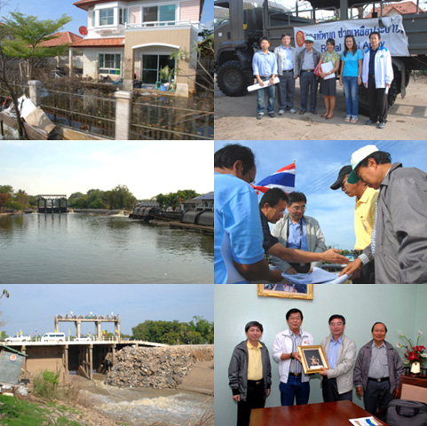 | On 11 December 2011, Professor Dr.Gao Zhanyi, President of ICID (International Commission on Irrigation and Drainage-ICID) has observed the area affected from 2011 Thailands most severe flood in Nonthaburi, Pathumthani, Singburi and Chainat provinces. Briefs by the officers of the Royal Irrigation Department about the flooding causes and management and site visits were made at Rangsit Nua Project, Bang Chom Sri Regulator and Prangam Regulator. In this occasion, Dr. Gao has made a courtesy call to Mr. Chalit Damrongsak, THAICID President and Director General of the Royal Irrigation Department who came to welcome Dr.Gao at Chao Phraya Diversion Dam, Chainat Province. After brifted about flood management, the ICID President has expressed his appreciation for Mr. Chalits hard working in flood fighting to help the effected Thai people. |
